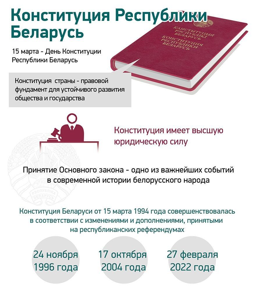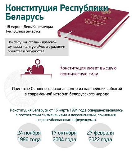 Обновленная в переломное для страны время Конституция сохранила основополагающие принципы миролюбия, социальной справедливости, уважения к достижениям прошлого, преемственность традиционных ценностей белорусского народа, стала надежной основой для укрепления общественного единства, социально-политической стабильности, слаженной и эффективной работы всех ветвей власти.